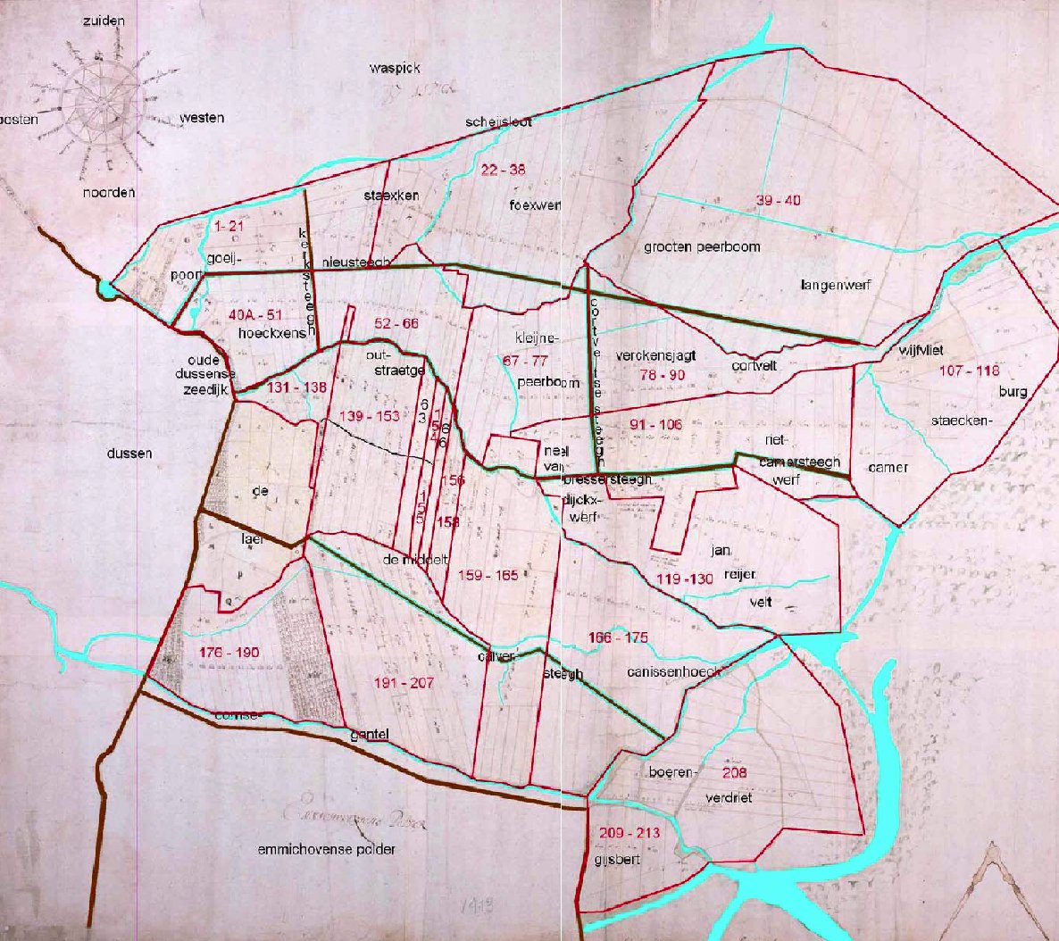 Caerte ende metinge gedaen bij mij ondergeschreven geswooren lantmeter met ende nevens den lantmeter ... Matheus van Nispen beijde door speciale laste ende ordre van den Edele Mogende Heeren de Raden ende Meesters van de rekeninge der domeinen van de Heeren Staaten van Hollandt ende WestFrieslandt, van de buijtelanden 1 achter Dussen soo van de gronden van de voorgemelde Heeren Staaten, als oock van de particulieren daer mede gelegen. In welcke landen bevat sijn mede oost bijden den ouden Dussensche Zeedijck 2 Zuijden den Scheijsloot ende landen van Waspeeke 3 , noorden der Cornschegantel ende Emmichovensche polder ende ten westen de opcomende aenwassen 4 van haer Ed: Hoog Mo: ten diepe gelegen. Daerinne is mede begrepen den Buijten Gijsbert 5 en ende geheele Boerenverdriet 6 waarvan een gedeelte onder Althena gelegen is, alles gemeten met de Zuijthollandsche roeden 7 , langs den Scheijsloot ende kaden van den Gijsbert drueppen? snoondts?, ende voorts alomme ter halver slooten killen? wegen en stegen, ende alsoo groot bevonden te samen veerthien hondert een en zestich [1461] mergen 8 ende clxxxi½ [181] roeden, daer van de Particulieren Eijgenaers toebehoren iiii c xxvi [462] mergen iii c lxvii [367] roeden, sijnde de grootte van ijeder parthije apart gemeten en het ...verkavelt hier nevens gevoecht, geexpresseerd ende alhier gestelt ten kleinen voet? ende na dier rechte conste der G...meten, gedaen in den maanden april, meij, junij, julij ende augusti xvi c negen ende sestich [1669]
